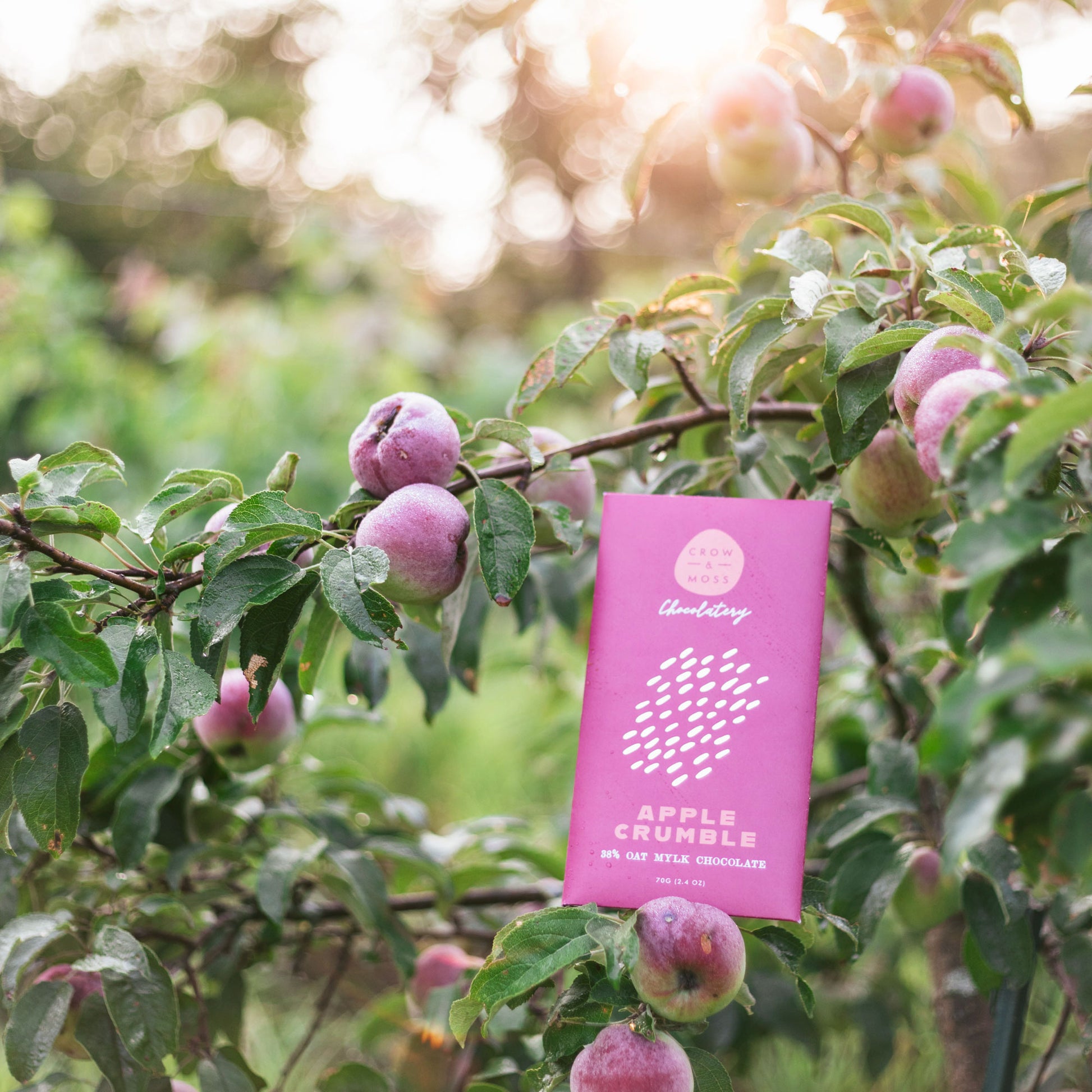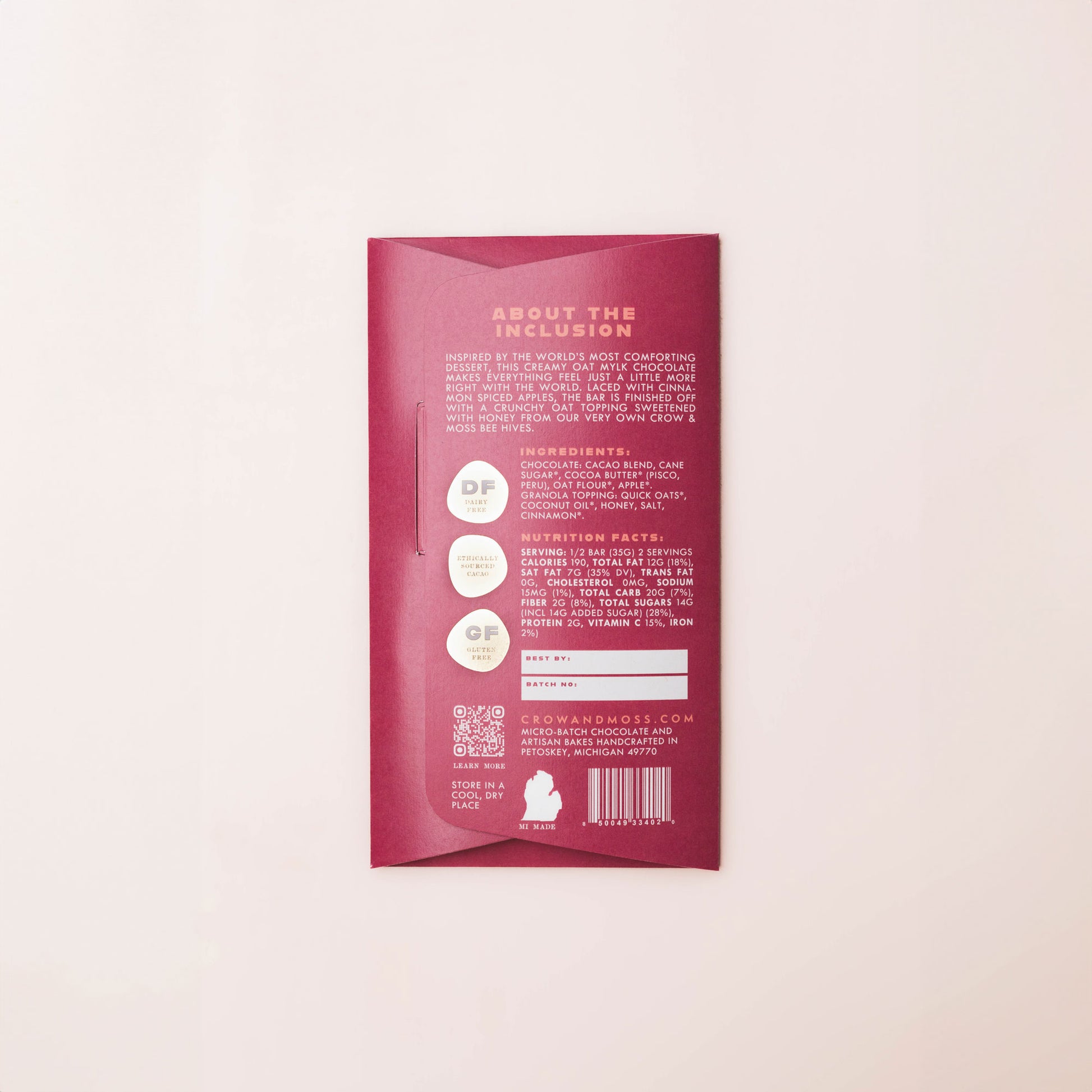 Inspired by the world's most comforting dessert, this creamy oat milk chocolate makes everything feel just a little more right with the world. Laced with cinnamon spiced apples, the bar is finished off with a crunchy oat topping sweetened with honey from our very own Crow & Moss bee hives.