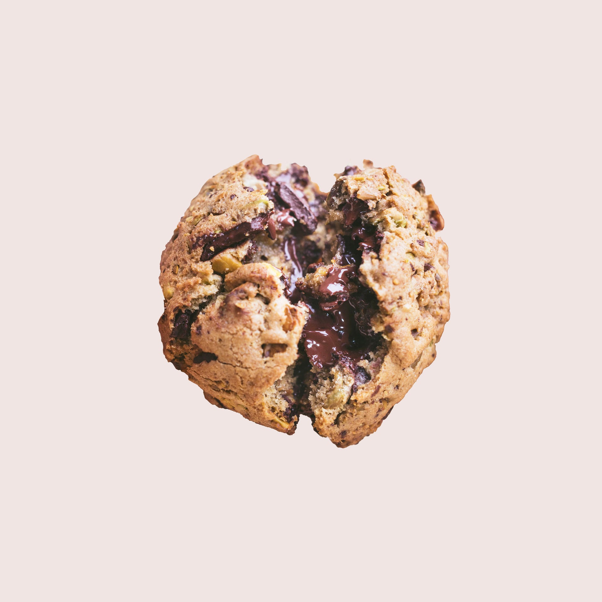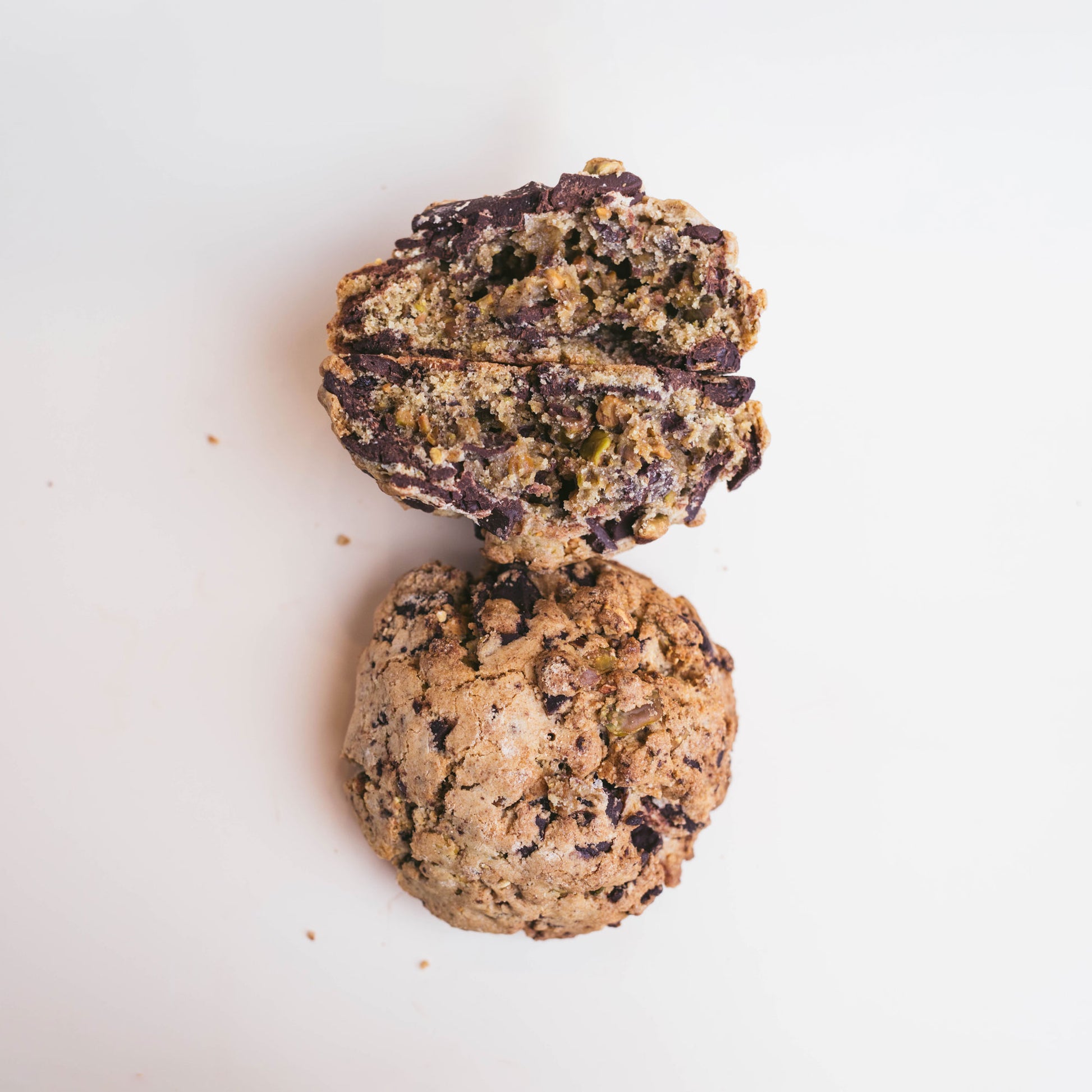 Ingredients: Flour*, butter*, brown sugar, cane sugar, salt, eggs*, vanilla extract, baking powder, baking soda, Honduras Wampusirpi 70% Dark Chocolate, and pistachios (* denotes organic ingredients).