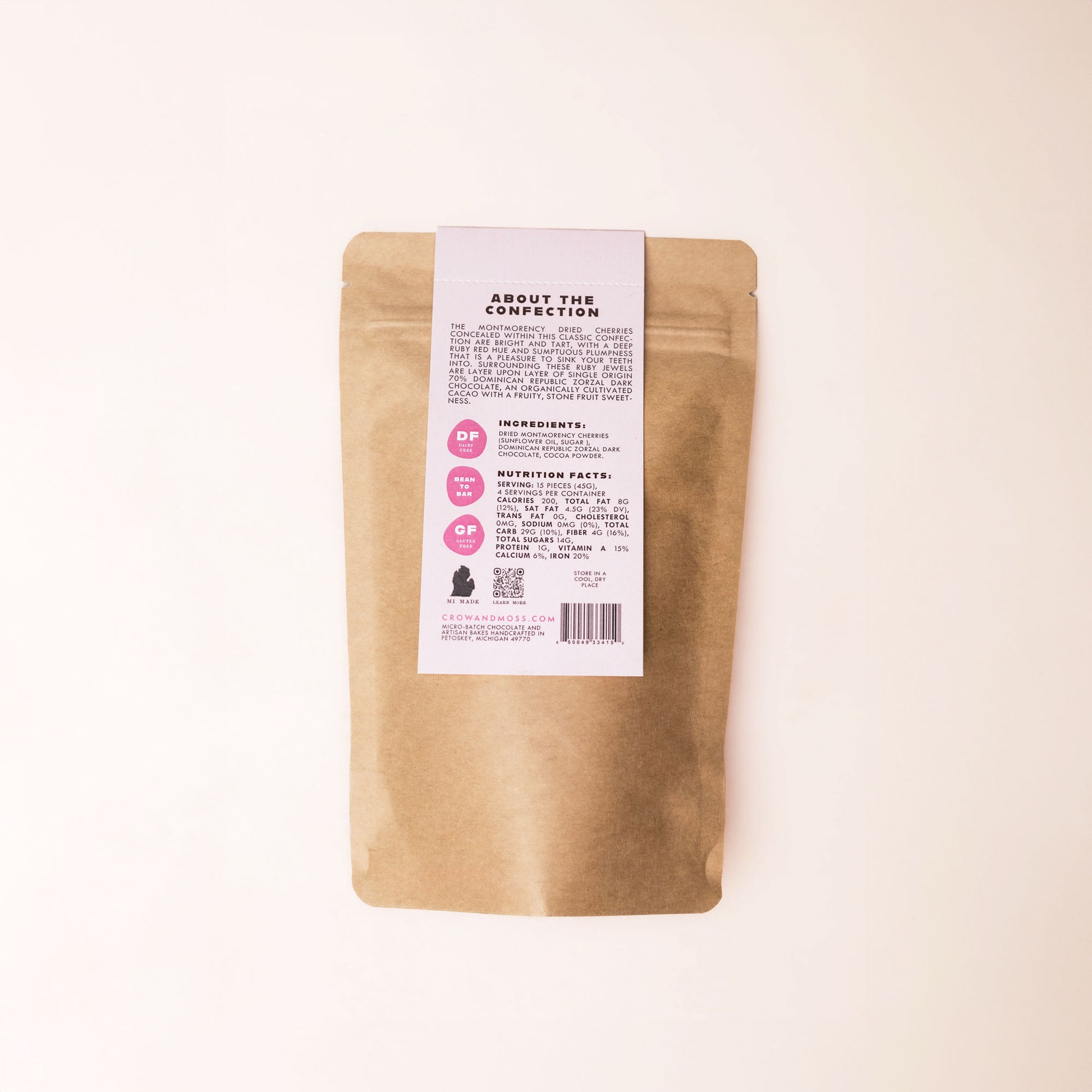 Dried Montmorency cherries (sunflower oil, sugar ), dominican republic zorzal dark chocolate, cocoa powder.