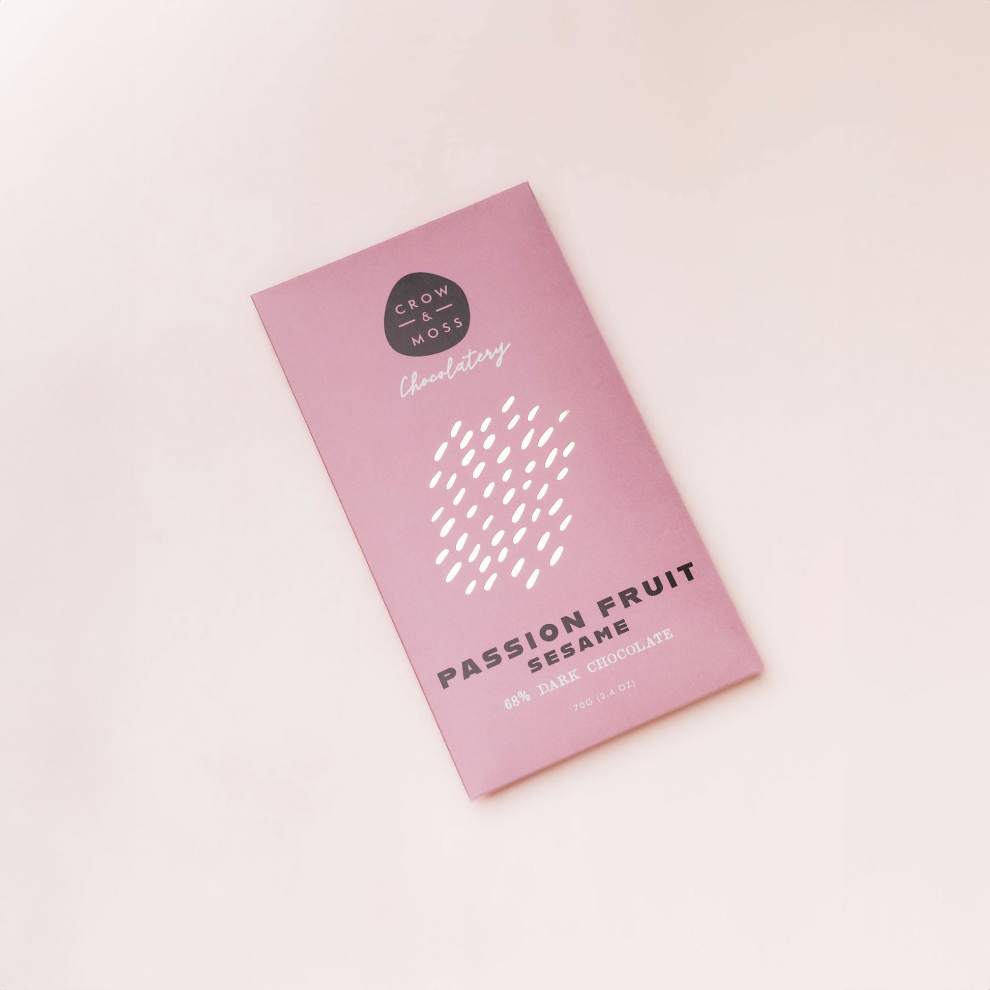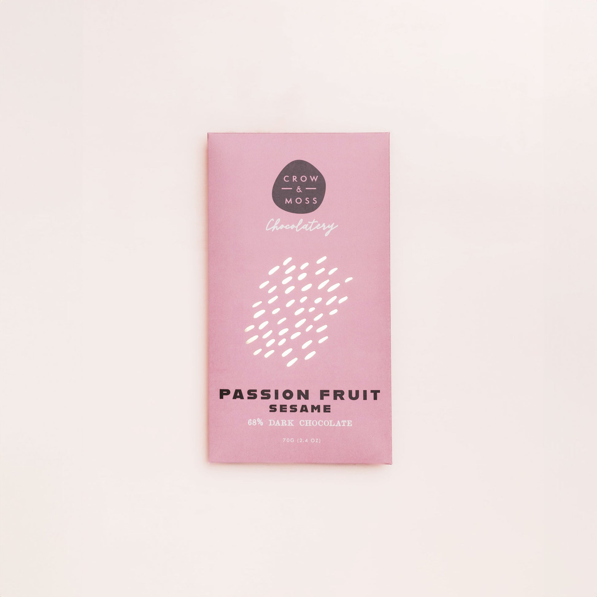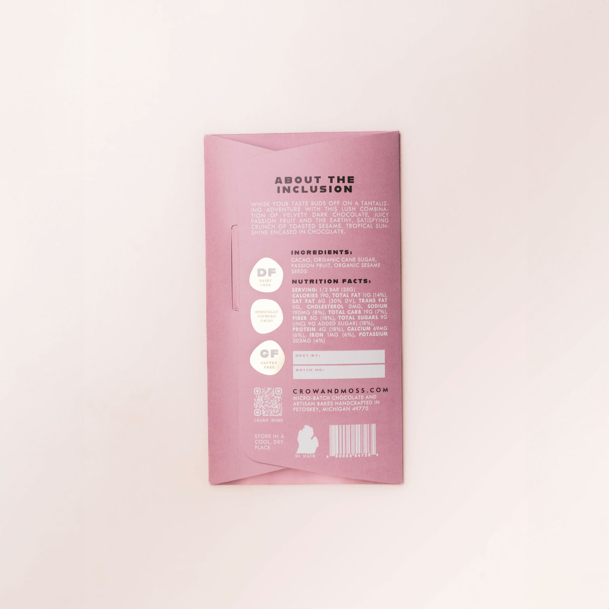 Ingredients: Cacao blend, organic cane sugar, passion fruit, organic sesame seeds